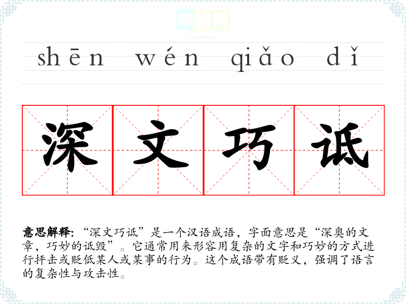 “深文巧诋”的起源并不十分明确,但可以追溯到古代文人之间的争斗与攻讦。在文人雅士的交往中,常常会使用隐晦的语言来表达对他人的不满或批评,形成了“深文”的特征。而“巧诋”则指代那些巧妙而又不易被察觉的贬低之辞,反映出古代社会中,文人们通过文字进行斗争的智慧与策略。
