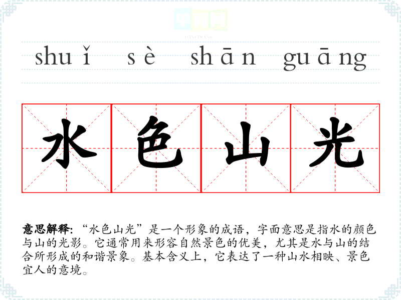 “水色山光”是一个形象的成语,字面意思是指水的颜色与山的光影。它通常用来形容自然景色的优美,尤其是水与山的结合所形成的和谐景象。基本含义上,它表达了一种山水相映、景色宜人的意境。