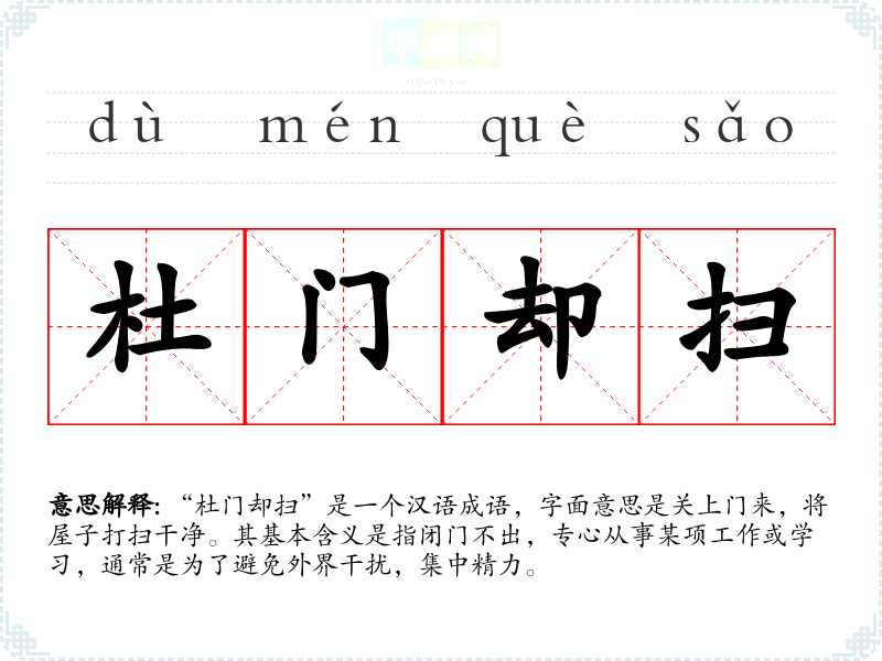 “杜门却扫”是一个汉语成语,字面意思是关上门来,将屋子打扫干净。其基本含义是指闭门不出,专心从事某项工作或学*,通常是为了避免外界干扰,集中精力。