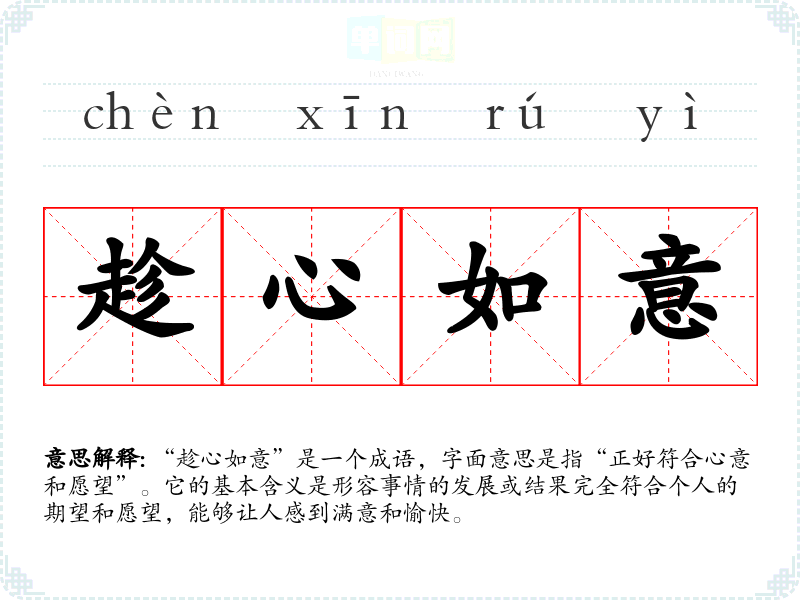 “趁心如意”是一个成语,字面意思是指“正好符合心意和愿望”。它的基本含义是形容事情的发展或结果完全符合个人的期望和愿望,能够让人感到满意和愉快。