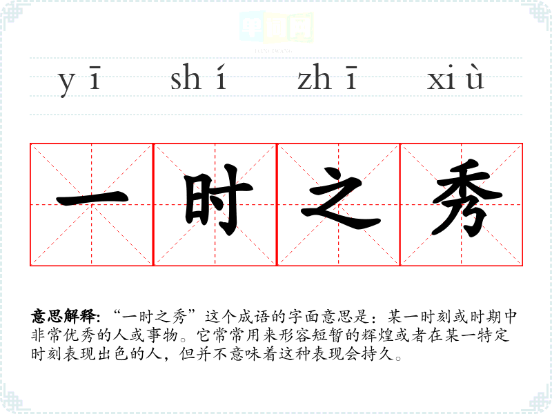 “一时之秀”这个成语的字面意思是:某一时刻或时期中非常优秀的人或事物。它常常用来形容短暂的辉煌或者在某一特定时刻表现出色的人,但并不意味着这种表现会持久。