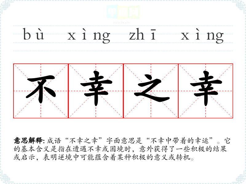 成语“不幸之幸”字面意思是“不幸中带着的幸运”。它的基本含义是指在遭遇不幸或困境时,意外获得了一些积极的结果或启示,表明逆境中可能蕴含着某种积极的意义或转机。