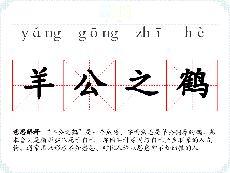 “羊公之鹤”是一个成语,字面意思是羊公饲养的鹤。基本含义是指那些不属于自己,却因某种原因与自己产生联系的人或物,通常用来形容不知感恩、对他人施以恩惠却不知回报的人。