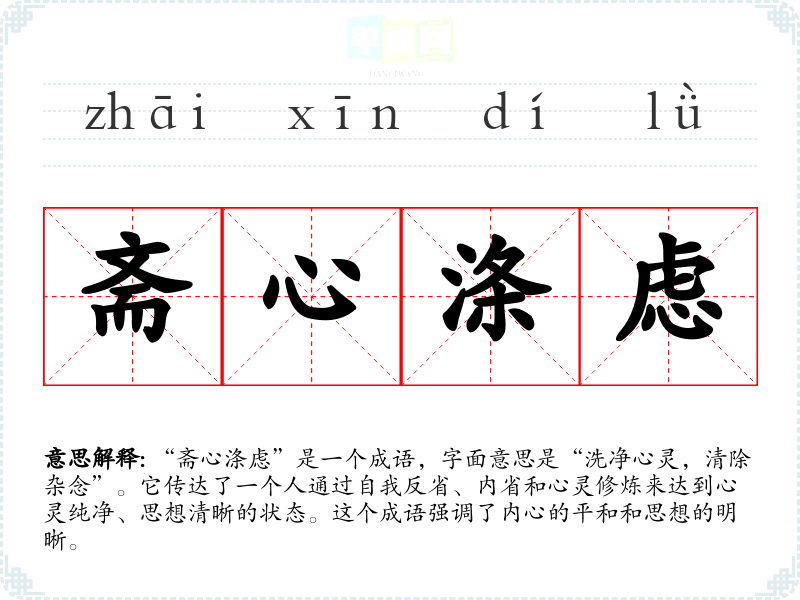 | 斋心涤虑 | 净洁身心,清除杂念。 |
