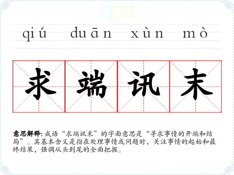 “求端讯末”并没有确切的历史来源或典故,但可以从字面上分析。成语中的“端”指的是开始、开端,而“末”指的是结束、结尾。“讯”则有询问、了解的意思。因此,这个成语可以看作是对事情全局的关注,强调了解事情的来龙去脉。