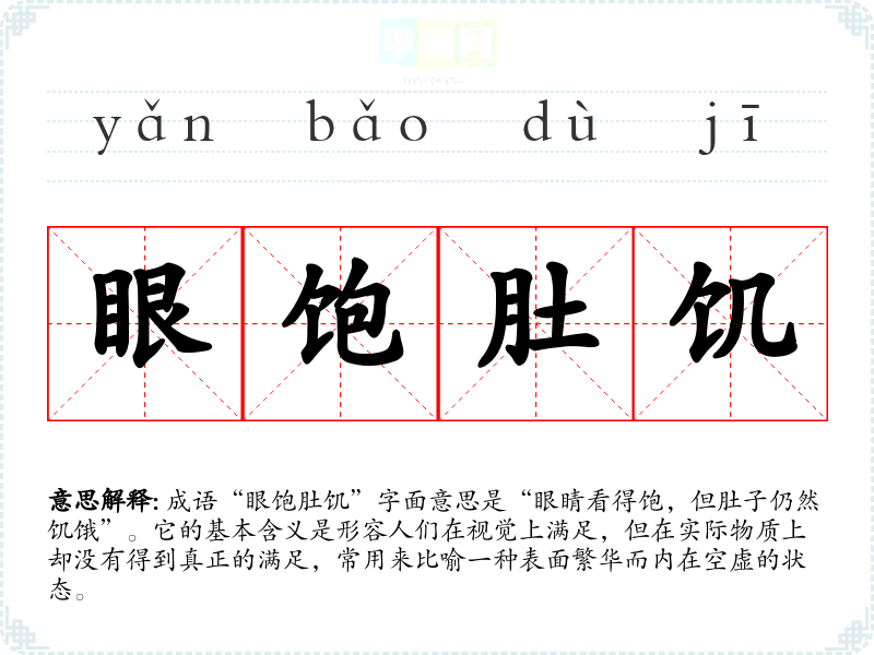 成语“眼饱肚饥”字面意思是“眼睛看得饱,但肚子仍然饥饿”。它的基本含义是形容人们在视觉上满足,但在实际物质上却没有得到真正的满足,常用来比喻一种表面繁华而内在空虚的状态。