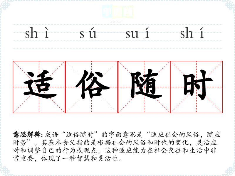 通过对“适俗随时”的学,我深刻认识到,适应变化、灵活应对是个人和社会发展的重要能力。在语言学和表达中,理解这种成语的含义和使用场景,可以帮助我更好地与他人沟通,提升我的社交能力和适应能力。