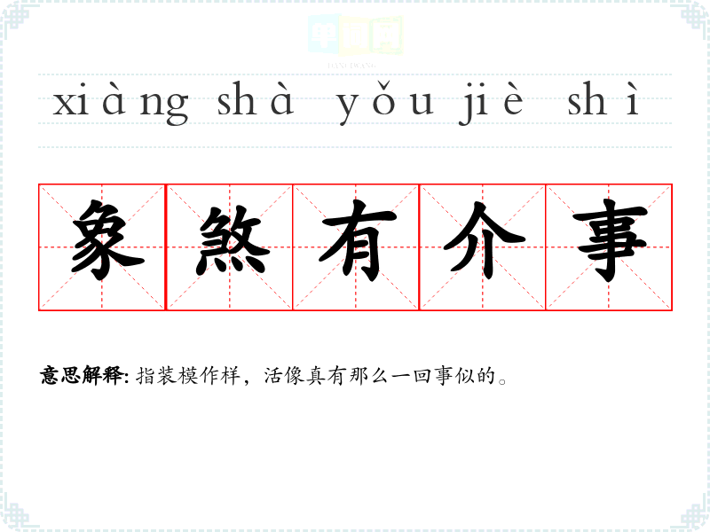 | 象煞有介事 | 指装模作样,活像真有那么一回事似的。 |