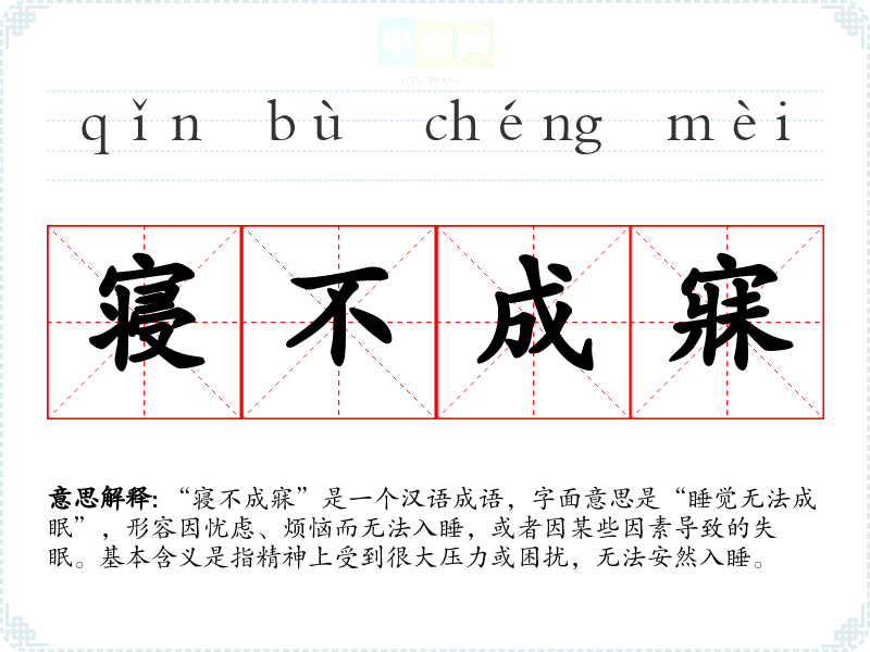 “寝不成寐”出自《诗经·小雅》,原文为“寝不成寐”,意思是躺下去也无法入睡。该成语反映了早期社会对睡眠质量的重视,也表达了人们在面对困扰时的无奈与痛苦。