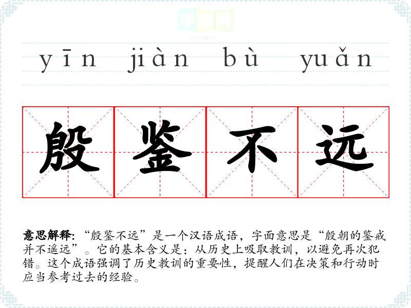 “殷鉴不远”是一个汉语成语,字面意思是“殷朝的鉴戒并不遥远”。它的基本含义是:从历史上吸取教训,以避免再次犯错。这个成语强调了历史教训的重要性,提醒人们在决策和行动时应当参考过去的经验。