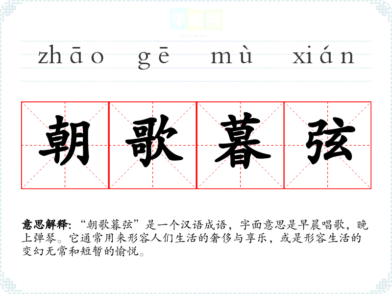 “朝歌暮弦”是一个汉语成语,字面意思是早晨唱歌,晚上弹琴。它通常用来形容人们生活的奢侈与享乐,或是形容生活的变幻无常和短暂的愉悦。