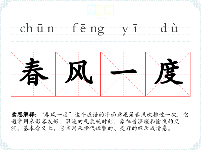 “春风一度”这个成语的字面意思是春风吹拂过一次。它通常用来形容友好、温暖的气氛或时刻,象征着温暖和愉悦的交流。基本含义上,它常用来指代短暂的、美好的经历或情感。