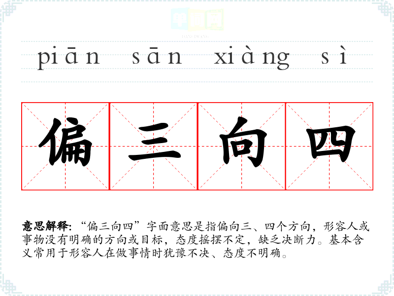 “偏三向四”字面意思是指偏向三、四个方向,形容人或事物没有明确的方向或目标,态度摇摆不定,缺乏决断力。基本含义常用于形容人在做事情时犹豫不决、态度不明确。