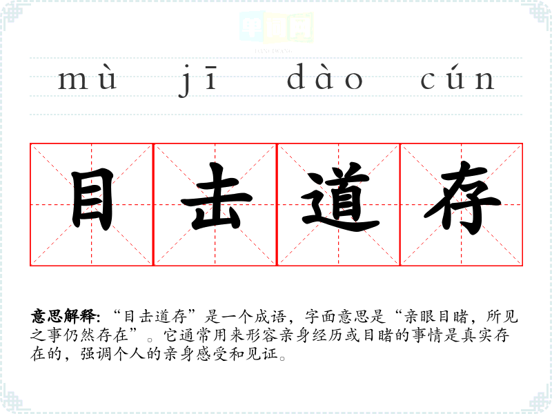 “目击道存”是一个成语,字面意思是“亲眼目睹,所见之事仍然存在”。它通常用来形容亲身经历或目睹的事情是真实存在的,强调个人的亲身感受和见证。