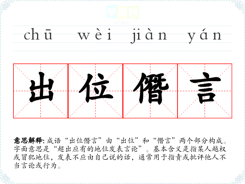 成语“出位僭言”由“出位”和“僭言”两个部分构成。字面意思是“超出应有的地位发表言论”。基本含义是指某人越权或冒犯地位,发表不应由自己说的话,通常用于指责或批评他人不当言论或行为。