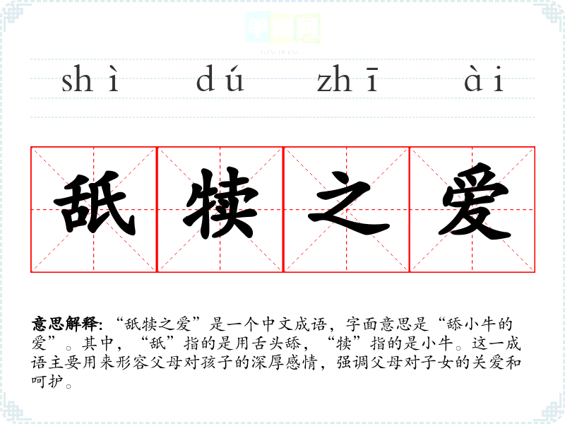 “舐犊之爱”是一个中文成语,字面意思是“舔小牛的爱”。其中,“舐”指的是用舌头舔,“犊”指的是小牛。这一成语主要用来形容父母对孩子的深厚感情,强调父母对子女的关爱和呵护。