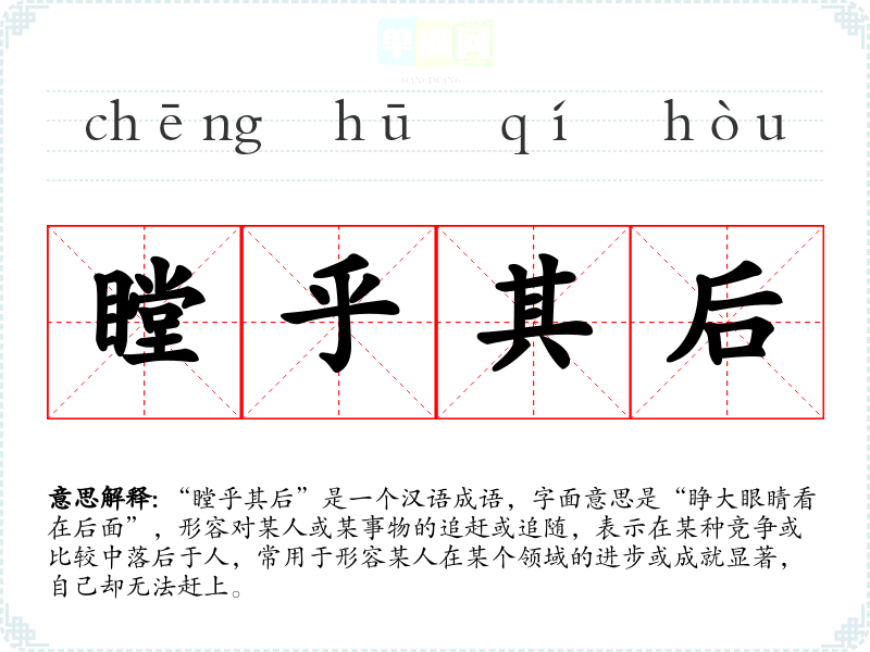 这个成语出自《论语·为政》:“业精于勤,荒于嬉;行成于思,毁于随。”其中提到“瞠乎其后”是为了强调努力和刻苦的重要性。原文中的“瞠乎其后”是描述一种追赶的状态,反映了对于成功的渴望和对比的感受。