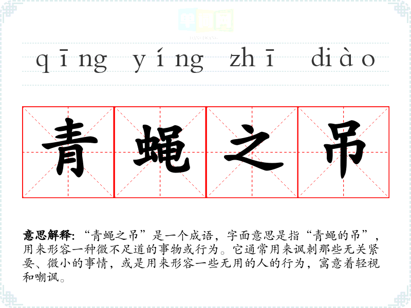 “青蝇之吊”是一个成语,字面意思是指“青蝇的吊”,用来形容一种微不足道的事物或行为。它通常用来讽刺那些无关紧要、微小的事情,或是用来形容一些无用的人的行为,寓意着轻视和嘲讽。