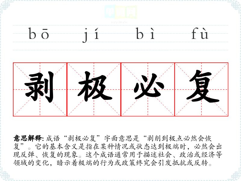 成语“剥极必复”字面意思是“剥削到极点必然会恢复”。它的基本含义是指在某种情况或状态达到极端时,必然会出现反弹、恢复的现象。这个成语通常用于描述社会、政治或经济等领域的变化,暗示着极端的行为或政策终究会引发抵抗或反转。