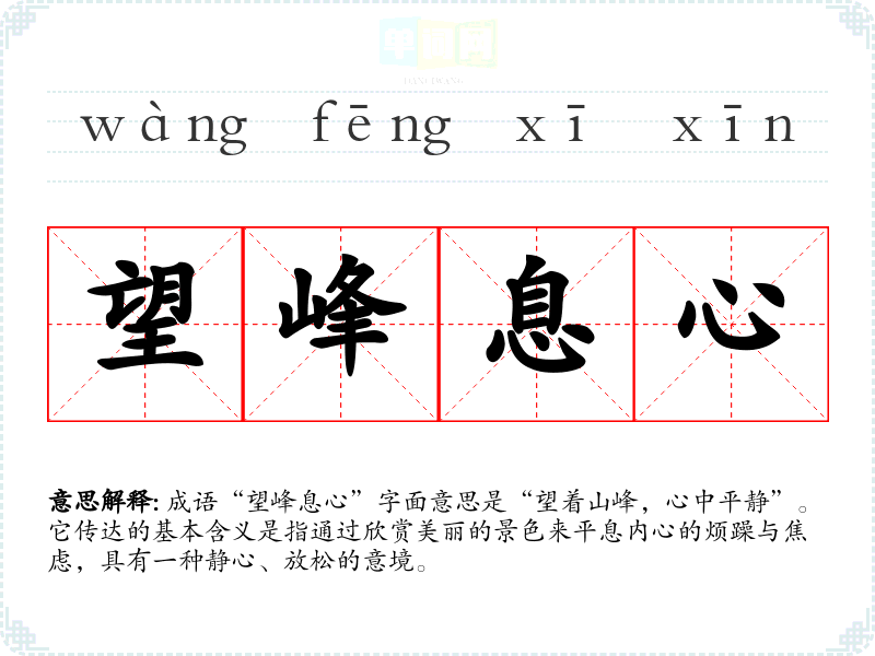 成语“望峰息心”字面意思是“望着山峰,心中平静”。它传达的基本含义是指通过欣赏美丽的景色来平息内心的烦躁与焦虑,具有一种静心、放松的意境。