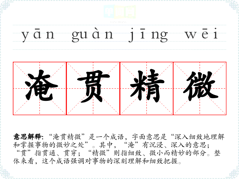 “淹贯精微”是一个成语,字面意思是“深入细致地理解和掌握事物的微妙之处”。其中,“淹”有沉浸、深入的意思;“贯”指贯通、贯穿;“精微”则指细致、微小而精妙的部分。整体来看,这个成语强调对事物的深刻理解和细致把握。