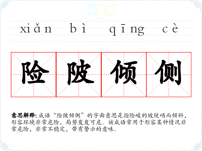 成语“险陂倾侧”的字面意思是指险峻的坡陡峭而倾斜,形容环境非常危险,局势岌岌可危。该成语常用于形容某种情况非常危险,非常不稳定,带有警示的意味。