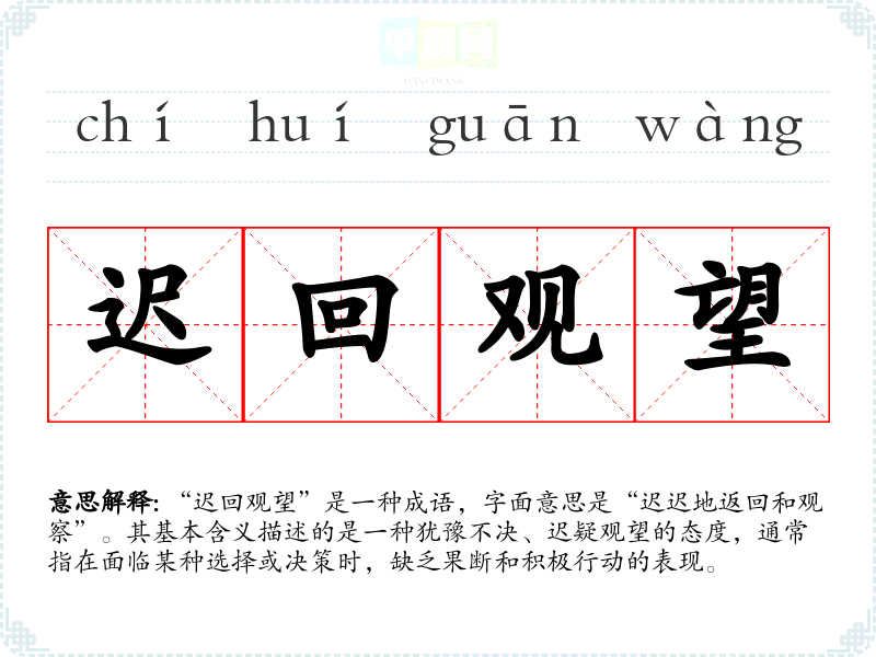 “迟回观望”是一种成语,字面意思是“迟迟地返回和观察”。其基本含义描述的是一种犹豫不决、迟疑观望的态度,通常指在面临某种选择或决策时,缺乏果断和积极行动的表现。
