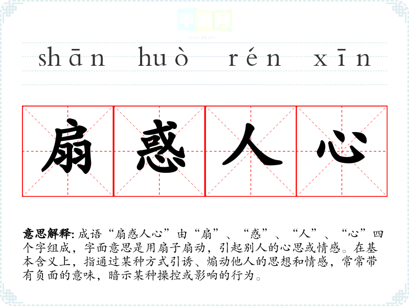 成语“扇惑人心”由“扇”、“惑”、“人”、“心”四个字组成,字面意思是用扇子扇动,引起别人的心思或情感。在基本含义上,指通过某种方式引诱、煽动他人的思想和情感,常常带有负面的意味,暗示某种操控或影响的行为。