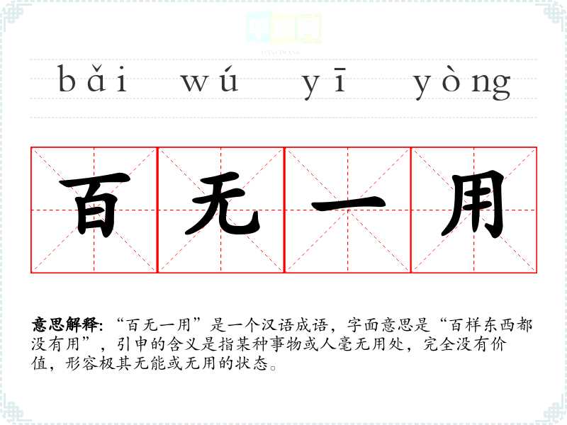 “百无一用”是一个汉语成语,字面意思是“百样东西都没有用”,引申的含义是指某种事物或人毫无用处,完全没有价值,形容极其无能或无用的状态。
