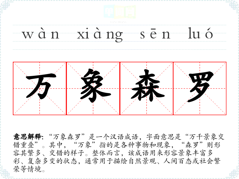| 森罗万象 | 森:众多;罗:罗列;万象:宇宙间各种事物和现象。指天地间纷纷罗列的各种各样的景象。形容包含的内容极为丰富。 |