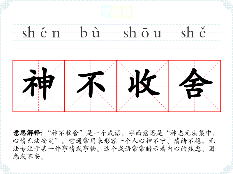 “神不收舍”是一个成语,字面意思是“神志无法集中,心情无法安定”。它通常用来形容一个人心神不宁、情绪不稳,无法专注于某一件事情或事物。这个成语常常暗示着内心的焦虑、困惑或不安。