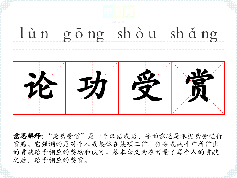 | 论功受赏 | 评定功劳,接受赏赐。 |