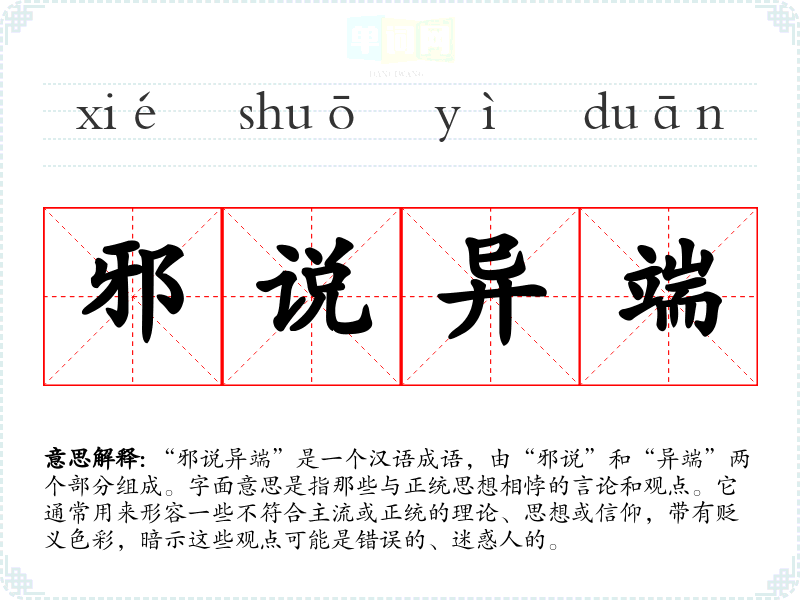 | 邪说异端 | 指和正统思想不同的有害的思想观点或言论学说。 |