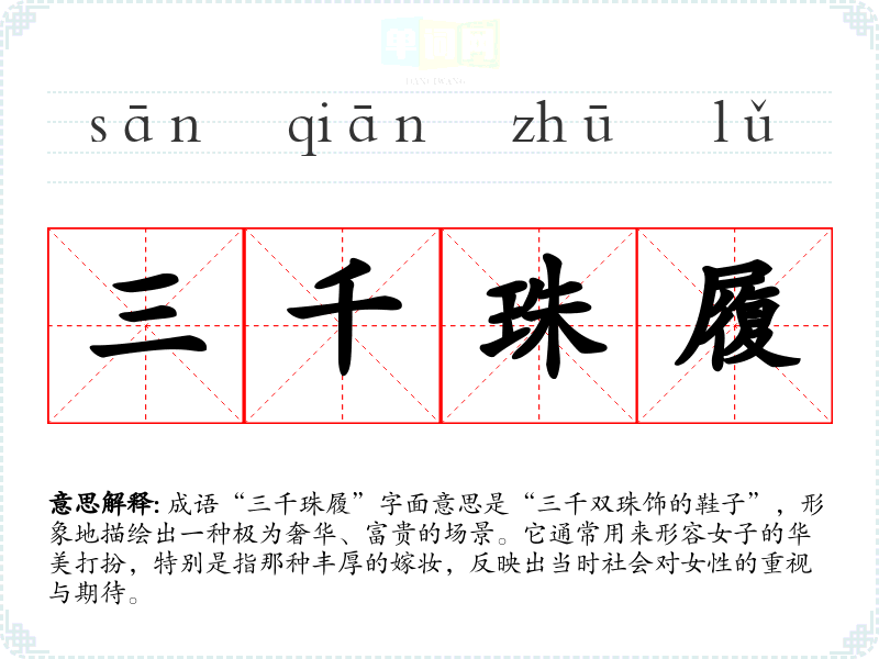成语“三千珠履”字面意思是“三千双珠饰的鞋子”,形象地描绘出一种极为奢华、富贵的场景。它通常用来形容女子的华美打扮,特别是指那种丰厚的嫁妆,反映出当时社会对女性的重视与期待。