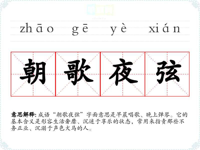 成语“朝歌夜弦”字面意思是早晨唱歌、晚上弹琴。它的基本含义是形容生活奢靡、沉迷于享乐的状态,常用来指责那些不务正业、沉溺于声色犬马的人。