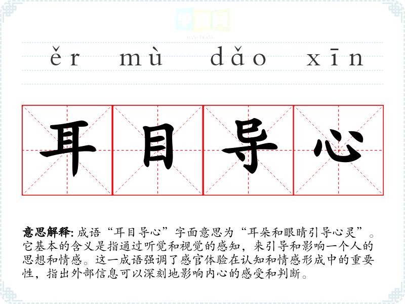 成语“耳目导心”字面意思为“耳朵和眼睛引导心灵”。它基本的含义是指通过听觉和视觉的感知,来引导和影响一个人的思想和情感。这一成语强调了感官体验在认知和情感形成中的重要性,指出外部信息可以深刻地影响内心的感受和判断。