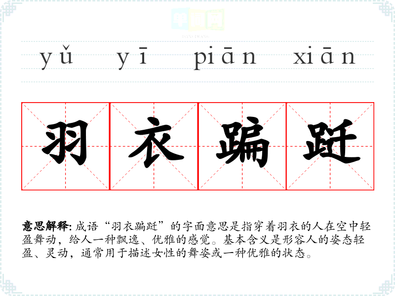 成语“羽衣蹁跹”的字面意思是指穿着羽衣的人在空中轻盈舞动,给人一种飘逸、优雅的感觉。基本含义是形容人的姿态轻盈、灵动,通常用于描述女性的舞姿或一种优雅的状态。