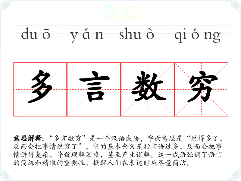 “多言数穷”是一个汉语成语,字面意思是“说得多了,反而会把事情说穷了”,它的基本含义是指言语过多,反而会把事情讲得复杂,导致理解困难,甚至产生误解。这一成语强调了语言的简练和精准的重要性,提醒人们在表达时应尽量简洁。