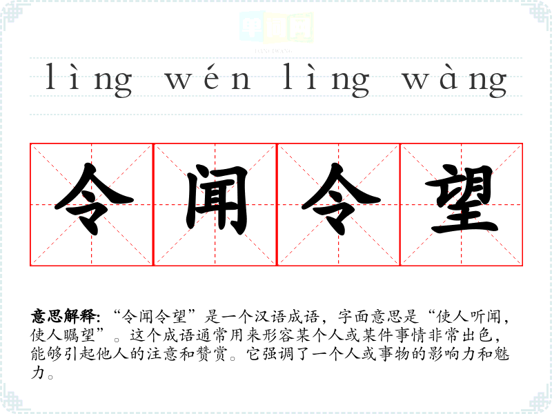 “令闻令望”带给人一种积极向上的情感反应,激励人们追求卓越和影响力。它也引发对成功的联想,促使人们思考如何提升自己的能力和魅力。
