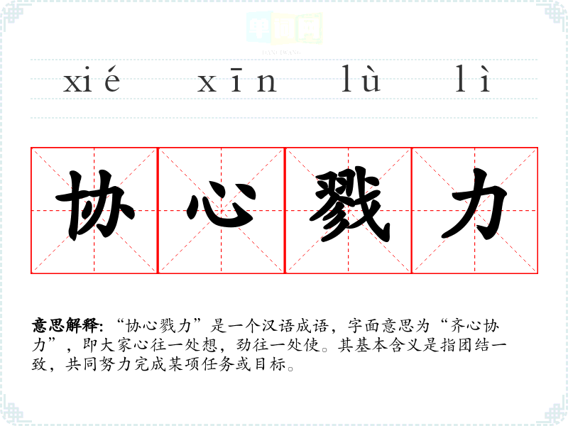 “协心戮力”是一个汉语成语,字面意思为“齐心协力”,即大家心往一处想,劲往一处使。其基本含义是指团结一致,共同努力完成某项任务或目标。