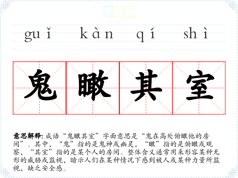 成语“鬼瞰其室”字面意思是“鬼在高处俯瞰他的房间”。其中,“鬼”指的是鬼神或幽灵,“瞰”指的是俯瞰或观察,“其室”指的是某个人的房间。整体含义通常用来形容某种无形的威胁或监视,暗示人们在某种情况下感到被人或某种力量所监视,缺乏安全感。