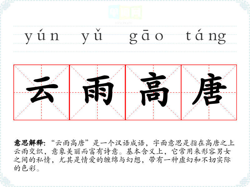 通过对“云雨高唐”的学,我更深刻地理解了理想与现实的关系,以及在表达情感时,语言的力量与美感。这个成语不仅丰富了我的词汇,也让我在表达和理解情感方面更加细腻,对我的语言学和表达能力有着重要的促进作用。