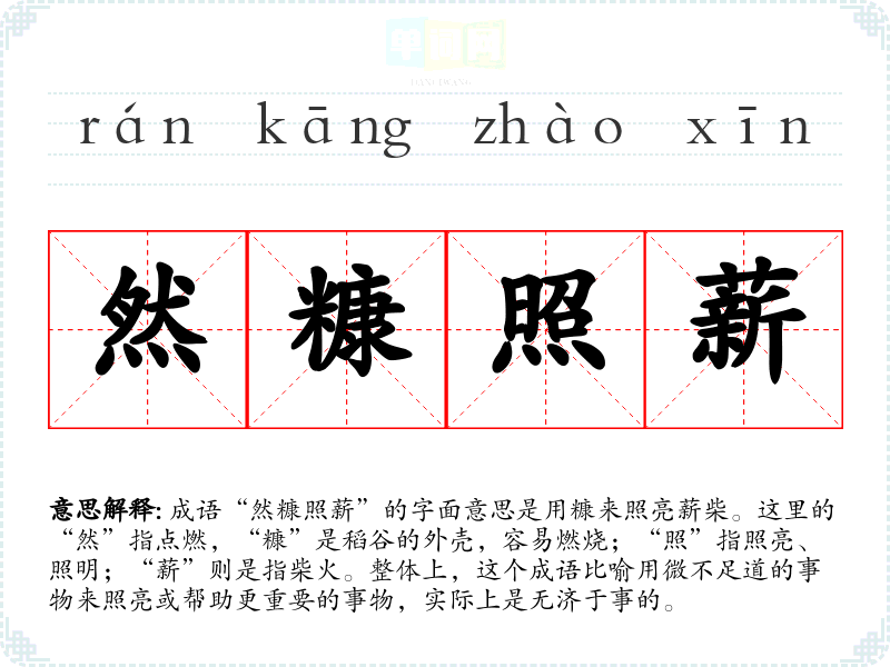 成语“然糠照薪”的字面意思是用糠来照亮薪柴。这里的“然”指点燃,“糠”是稻谷的外壳,容易燃烧;“照”指照亮、照明;“薪”则是指柴火。整体上,这个成语比喻用微不足道的事物来照亮或帮助更重要的事物,实际上是无济于事的。
