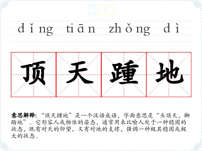 “顶天踵地”是一个汉语成语,字面意思是“头顶天,脚踏地”。它形容人或物体的姿态,通常用来比喻人处于一种稳固的状态,既有对天的仰望,又有对地的支撑,强调一种极其稳固或极大的状态。