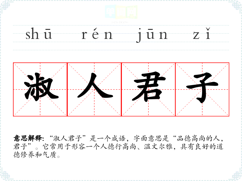 “淑人君子”是一个成语,字面意思是“品德高尚的人,君子”。它常用于形容一个人德行高尚、温文尔雅,具有良好的道德修养和气质。
