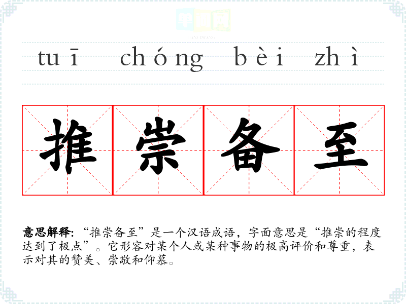“推崇备至”是一个汉语成语,字面意思是“推崇的程度达到了极点”。它形容对某个人或某种事物的极高评价和尊重,表示对其的赞美、崇敬和仰慕。