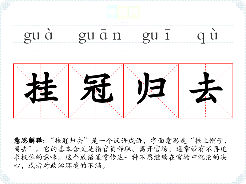 “挂冠归去”是一个汉语成语,字面意思是“挂上帽子,离去”。它的基本含义是指官员辞职、离开官场,通常带有不再追求权位的意味。这个成语通常传达一种不愿继续在官场中沉沦的决心,或者对政治环境的不满。