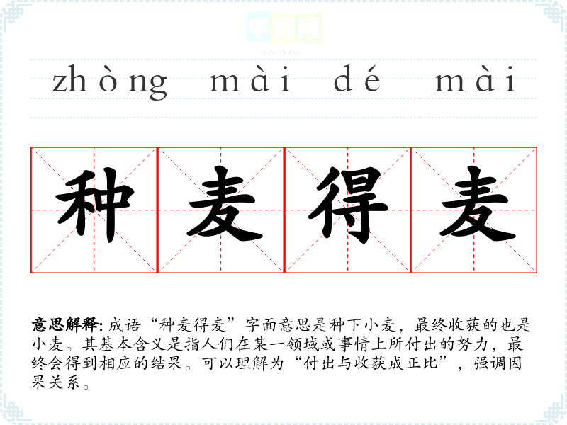 “种麦得麦”常用于日常对话、教育场合、演讲等,适用于强调努力与成果之间的关系。例如,在教育场合,教师可能会用这个成语来鼓励学生努力学*,或者在职场上,领导可能会用它来激励员工努力工作。