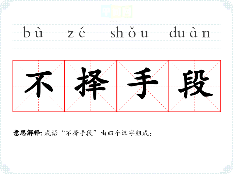 字面意思是“不选择手段”,引申含义为为了达到某种目的,不考虑使用什么样的方法,甚至可以是不道德的手段。常用来形容为达到目标而不惜一切代价。