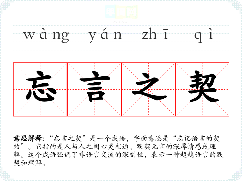 “忘言之契”是一个成语,字面意思是“忘记语言的契约”。它指的是人与人之间心灵相通、默契无言的深厚情感或理解。这个成语强调了非语言交流的深刻性,表示一种超越语言的默契和理解。